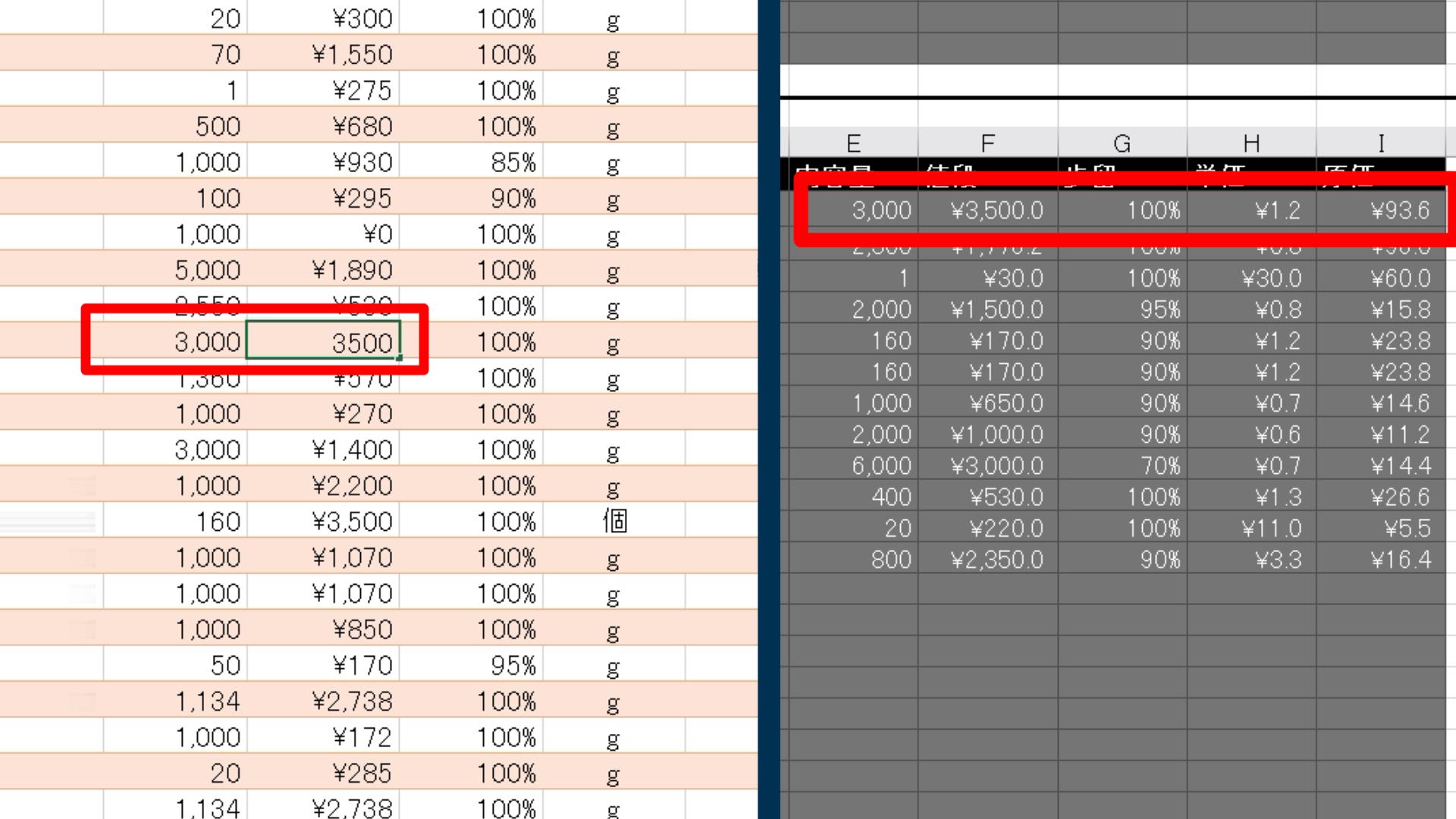 ・仕入れ金額が日々変わっても1つの部分のみ書き換えれば全て自動で再計算